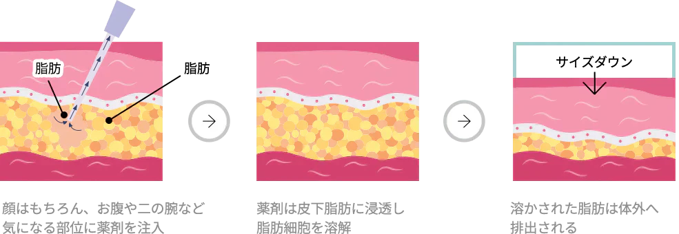 脂肪分解注射は、脂肪を分解して体外に排出されるように助ける手術で日常生活の回復が心配された方、手術が負担になった方に適した施術方法です。