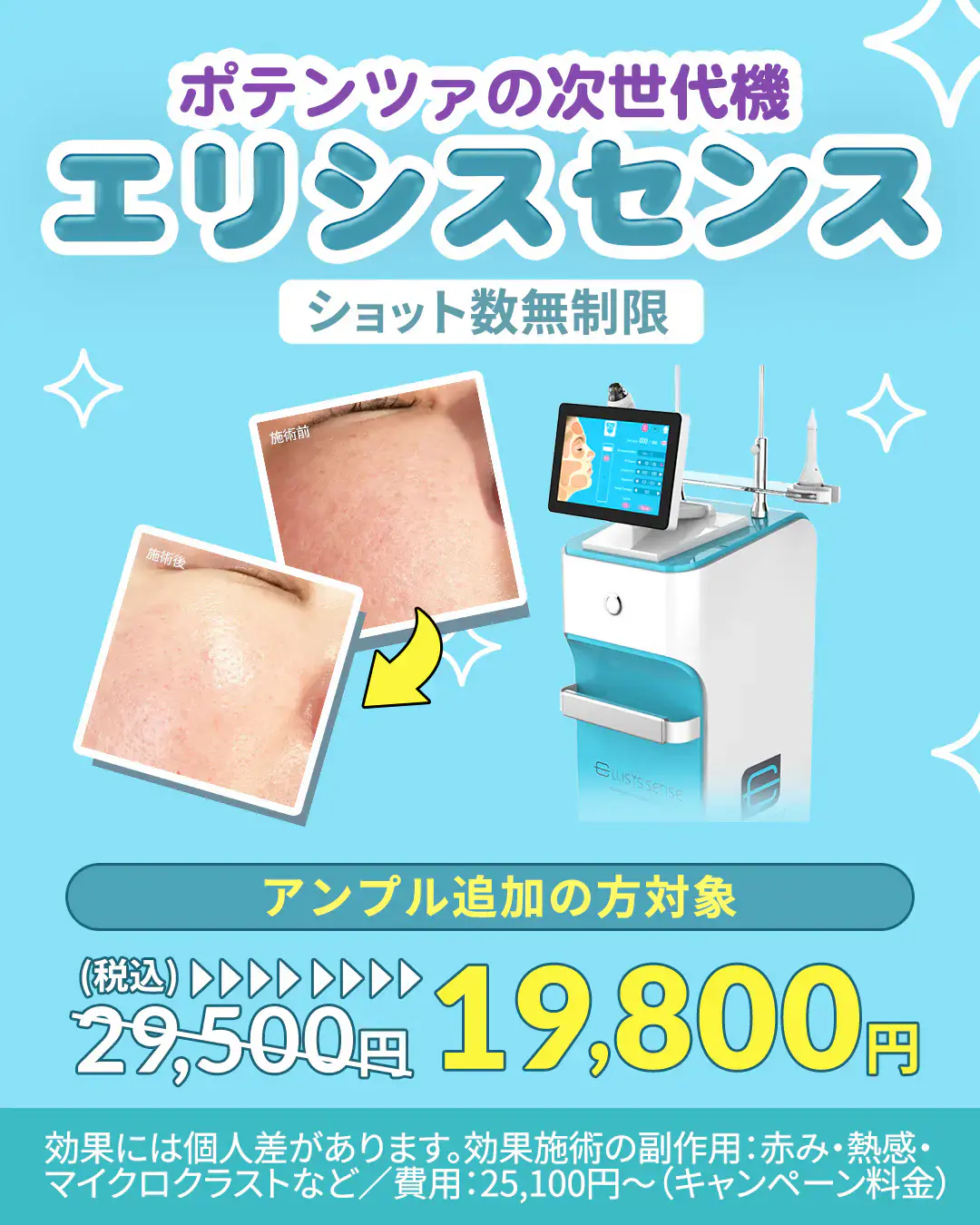 フラクショナル マイクロニードルラジオ波 (FMR) システムであるエリシスセンスは、皮膚真皮層にマイクロニードルを挿入してRF(高周波)エネルギーを送り込み、表皮のダメージを最小限に抑えながらコラーゲン再生を促進し、肌質改善を行う施術です。