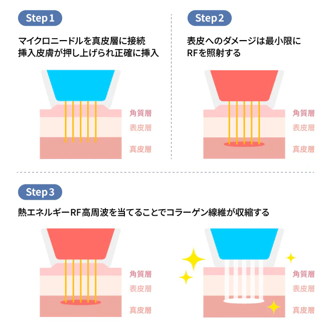 ポテンツァの次世代機で、皮膚の真皮層に微細な針(マイクロニードル)を挿入して表皮に熱損傷を起こすことなく、針先から真皮層に直接、瞬間的な高周波を照射する施術です。