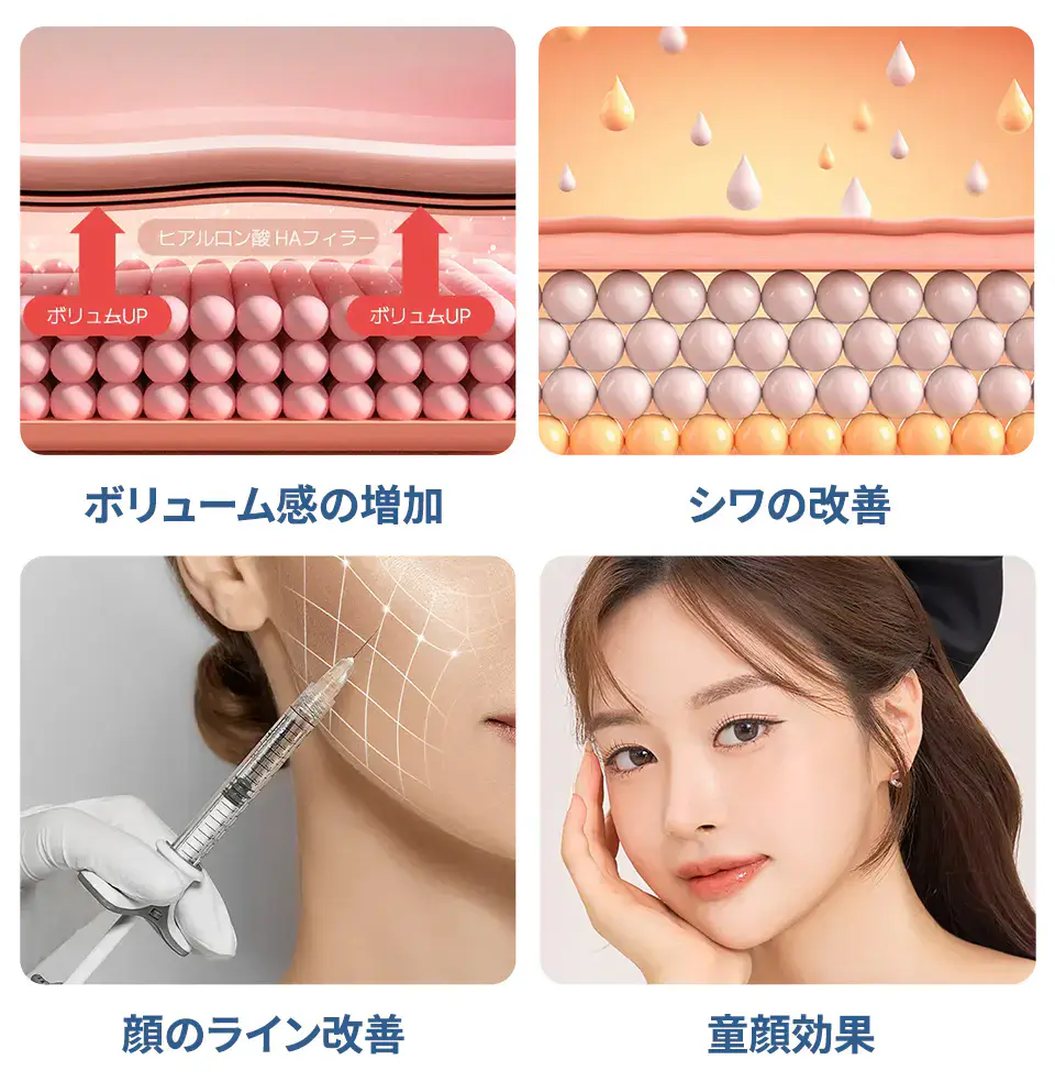 唇が薄い、輪郭がぼやけている、上下のバランスに差があるなどのお悩みに対し、自然なボリュームを与えることで目鼻立ちを引き立てます。さらに小じわの改善にも効果があると評価されています。